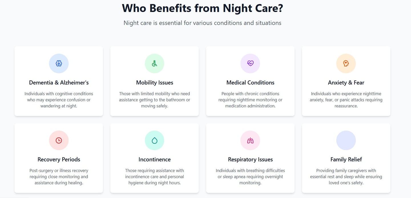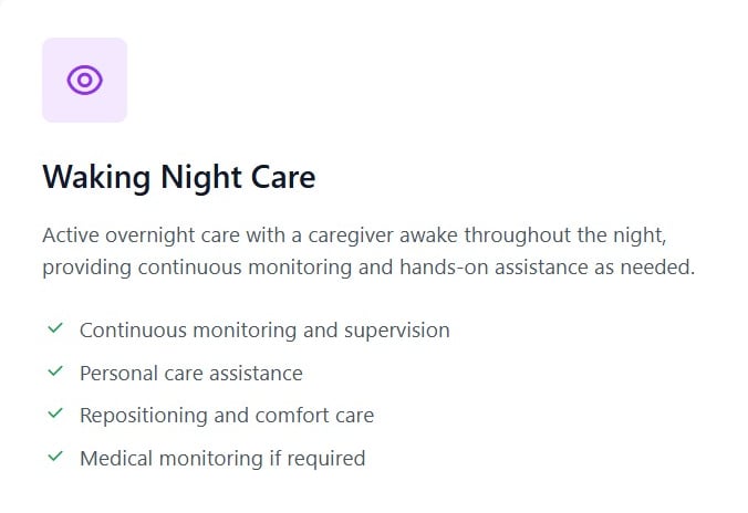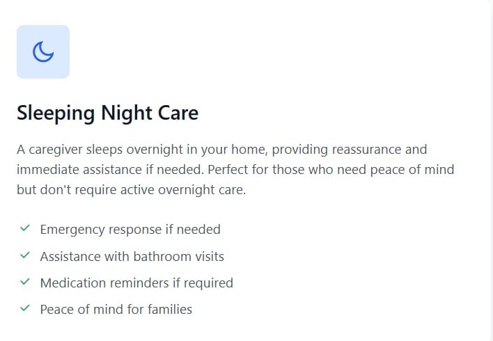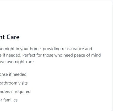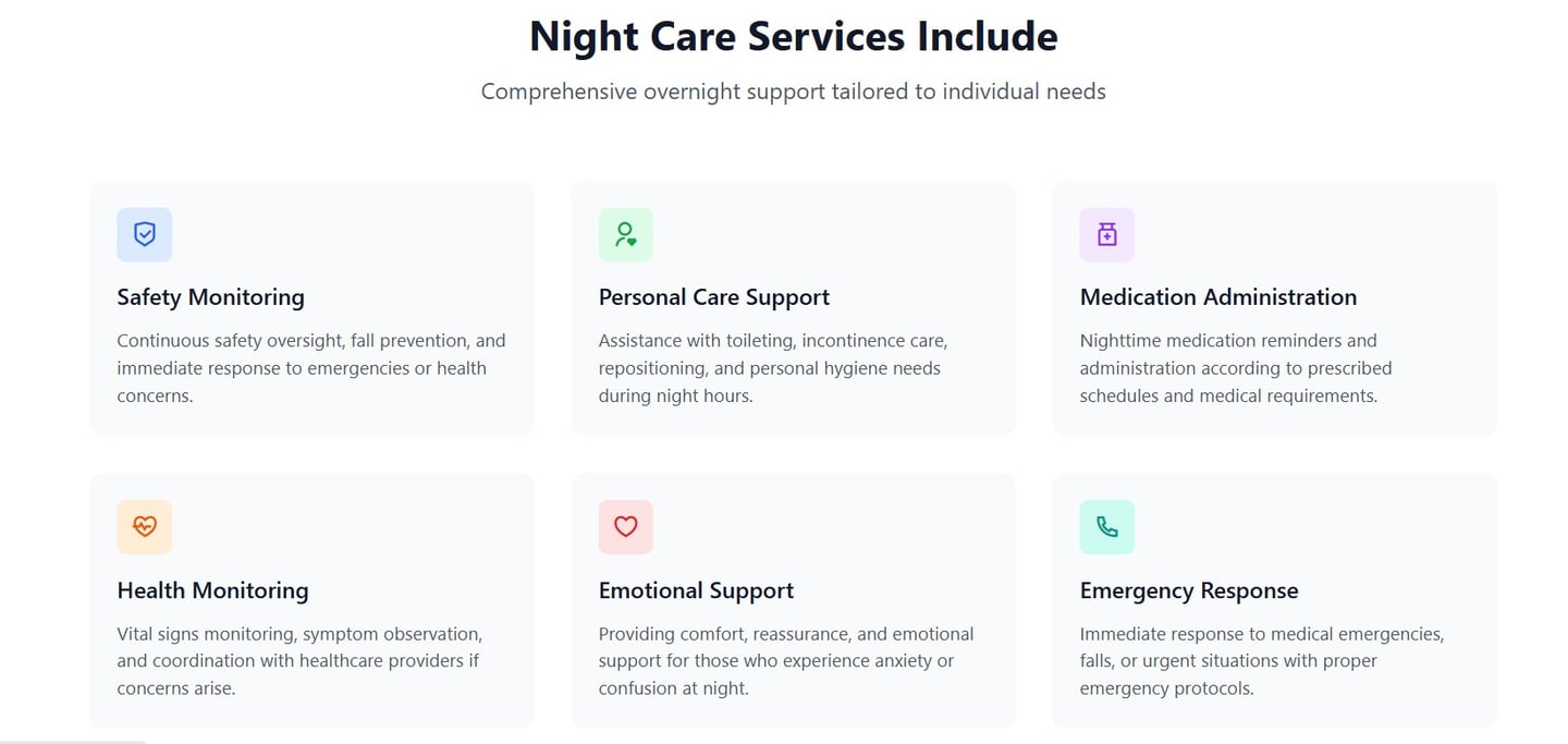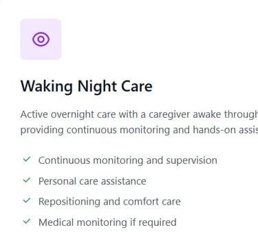 Professional overnight care and support to ensure safety, comfort, and peace of mind during nighttime hours. Our trained caregivers provide both sleeping and waking night services tailored to individual needs.