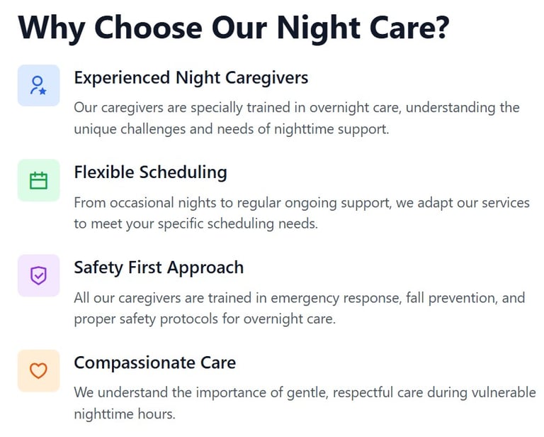Careful selection and matching of night caregivers based on personality, experience, and specialized skills needed.