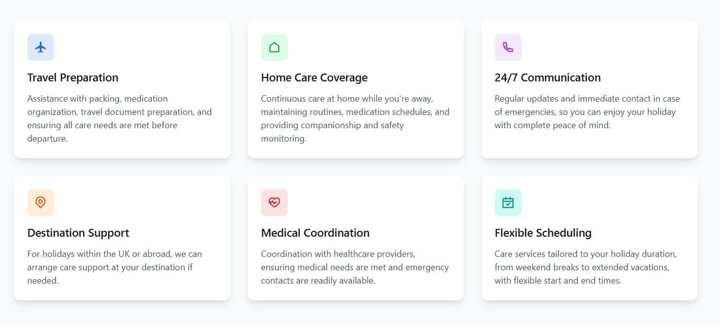 Don't let care needs prevent you from enjoying your well-deserved break. Our holiday care services ensure you can travel with confidence, knowing your loved one is in safe hands.