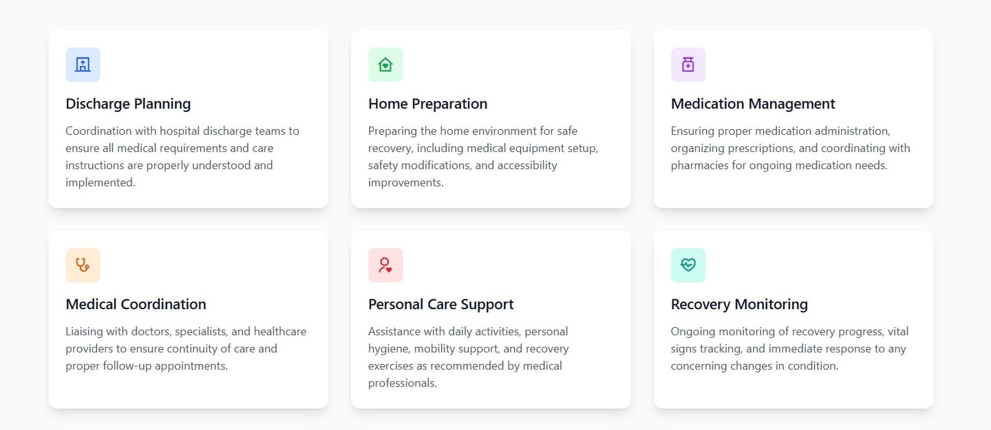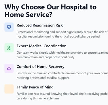 Smooth transitions from hospital to home with professional support every step of the way. We ensure your loved one receives the care they need during this critical period.