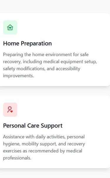 We prepare the home environment, arrange medical equipment, and ensure safety modifications are in place.
