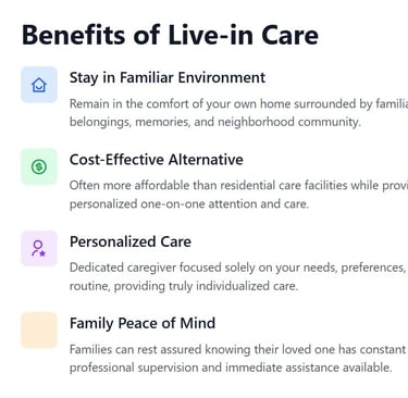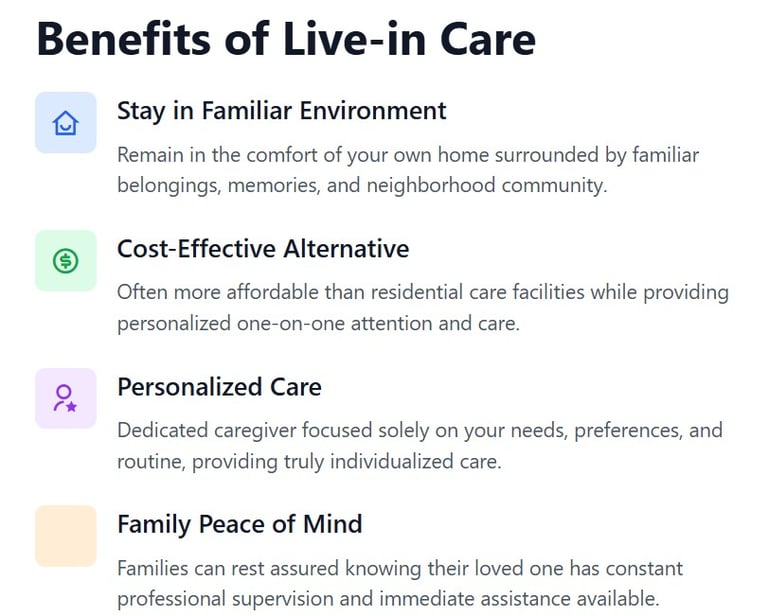 Our live-in caregivers provide continuous support, allowing you to maintain your independence and quality of life in the familiar comfort of your own home.